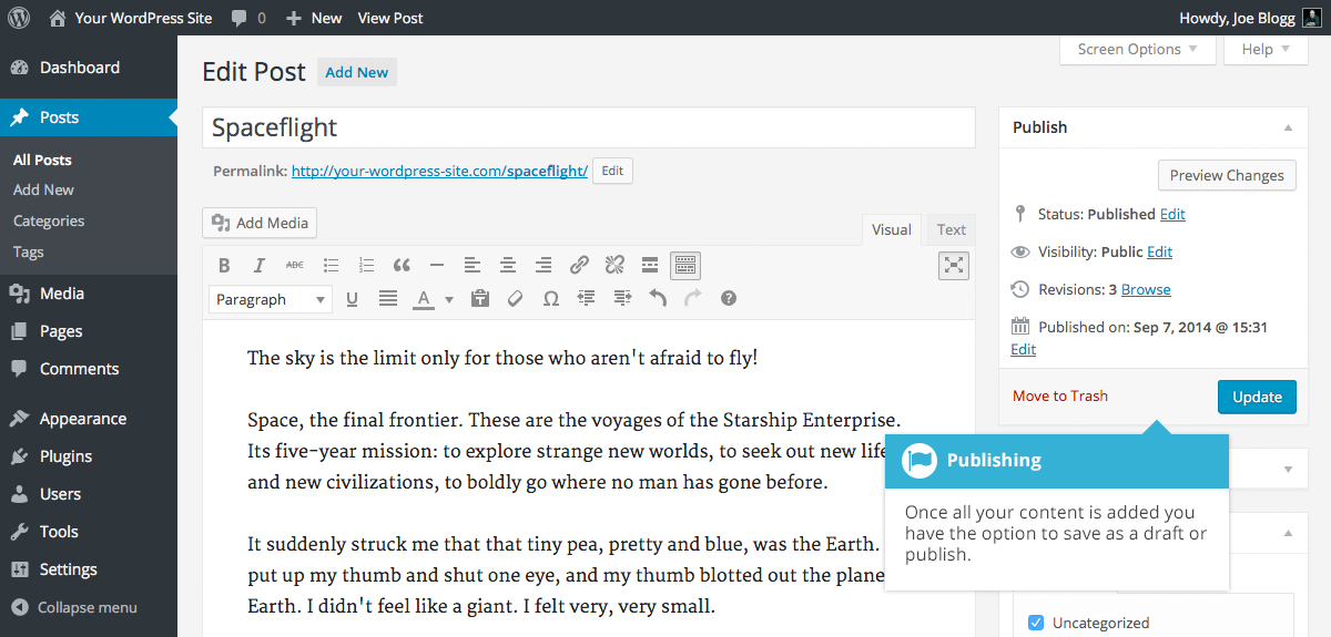 Once you’ve added all your content to your Page or Post you have the option of Saving the Page as a Draft or Publishing the page. Clicking the Save Draft button will simply save your Page/Post. This is handy if you would like to come back at a later date to add more content or if you’re simply not ready to publish yet.